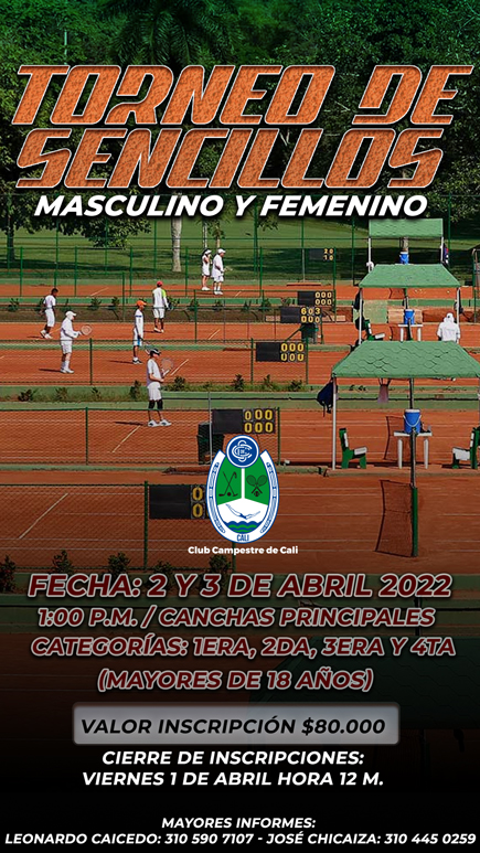 El ‘Torneo de Sencillos Masculino y Femenino’ de tenis, se realizará el sábado 2 y domingo 3 de abril a partir de la 1:00 p.m.