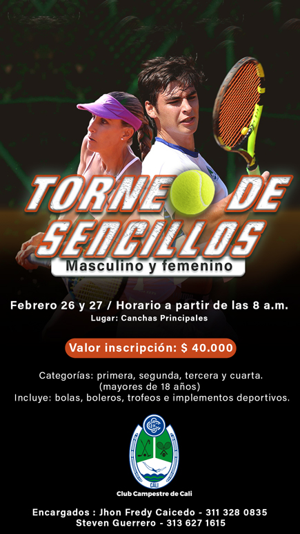 Los invitamos a participar del ‘Torneo de Sencillos’, que se jugará el sábado 26 y domingo 27 de febrero. Los esperamos.