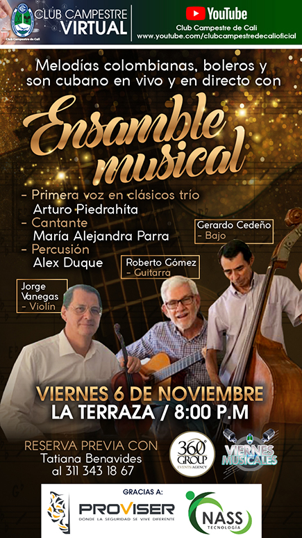 Los invitamos esta noche de Viernes Musicales a disfrutar del grupo Ensamble Musical, integrado por: Arturo Piedrahíta, primera voz en clásicos trío, María Alejandra Parra, cantante, Alex Duque, en la percusión, Jorge Vanegas, en el violín, Roberto Gómez, en la guitarra y Gerardo Cedeño, en el bajo. Emitiremos desde el #CampestreLiveStudio, ubicado en La Terraza. También lo pueden ver en vivo a través de nuestro canal de YouTube. www.YouTube.com/clubcampestredecalioficial