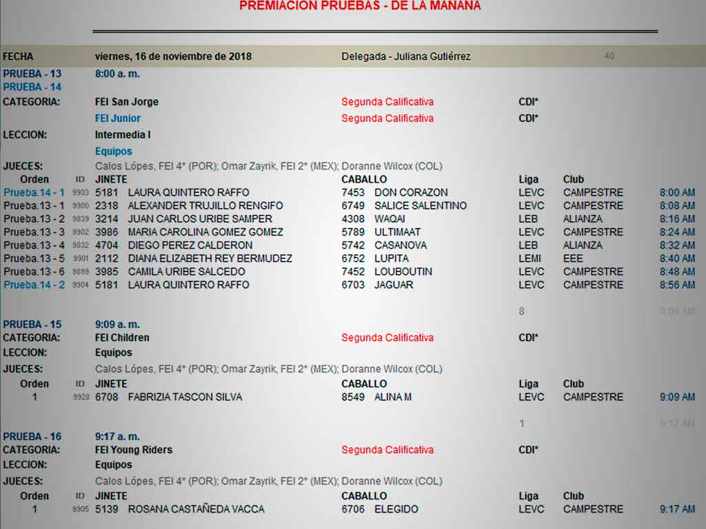 Otras categorías que compiten son Childrens, Juniors y Young Riders. Todos los jinetes bajo la mirada exhaustiva y profesional de jueces Internacionales como lo exige el CDI: Carlos López de Portugal, Omar Zyric de México y Doranne Wilcox juez colombo americana.